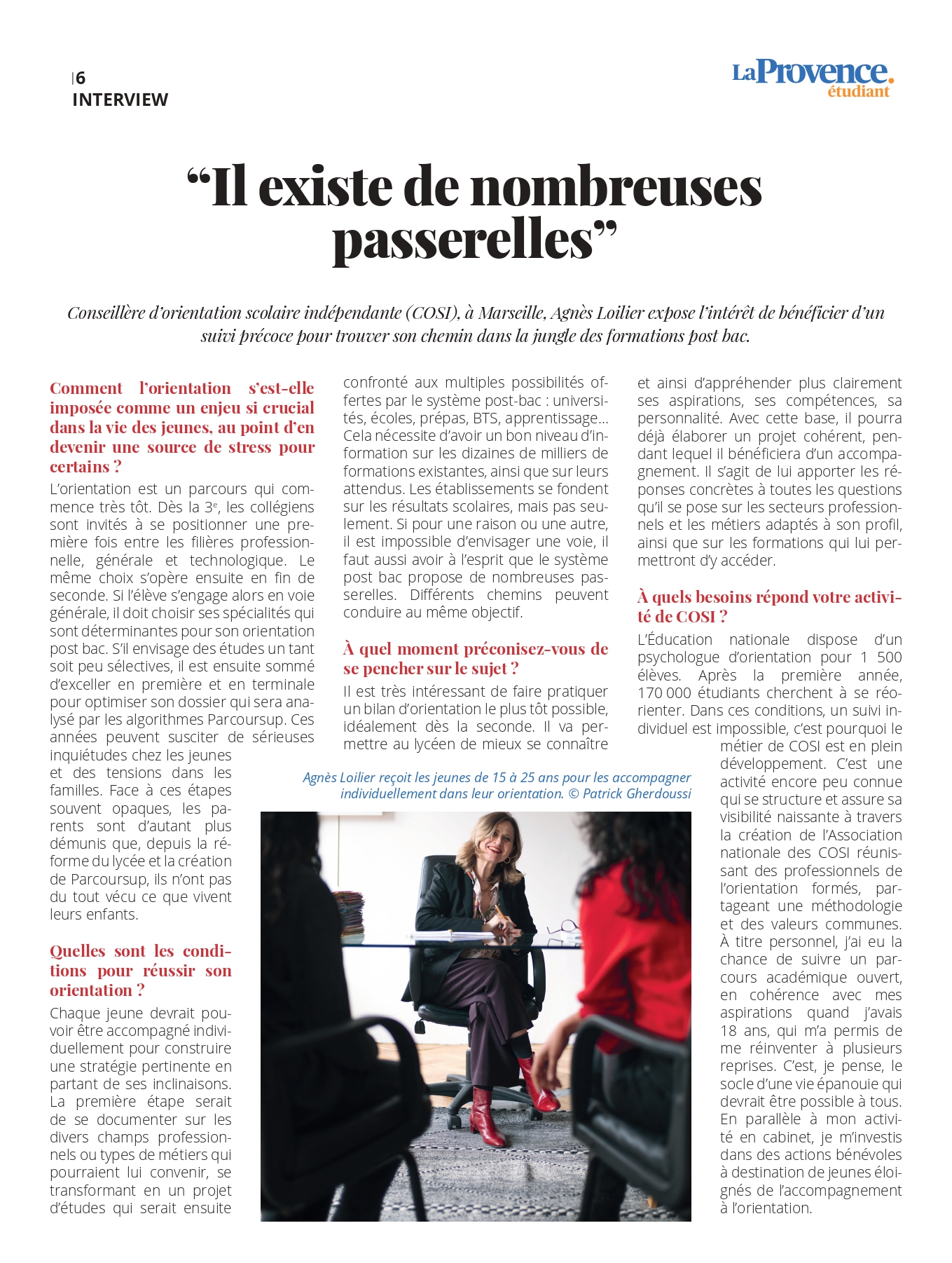 “Élève en classe de terminale, je me suis tournée vers Agnès Loilier afin de préciser mon projet d’orientation. En plus de me permettre de comprendre les rouages de la plateforme Parcoursup et les attendus des formations, elle m’a aidée à établir des plans B qui me correspondaient parfaitement. Par ailleurs, Mme Loilier m’a soutenue dans l’ensemble de mes candidatures et a toujours su trouver les bons mots pour me rassurer et me redonner confiance et motivation ; qui m’ont par la suite permis d’être admise à Sciences Po Paris. Son accompagnement fut très complet, et je lui suis particulièrement reconnaissante de sa bienveillance et de son écoute sans faille. Je considère qu’elle a joué un rôle clé dans mon admission à l’école de mes rêves.